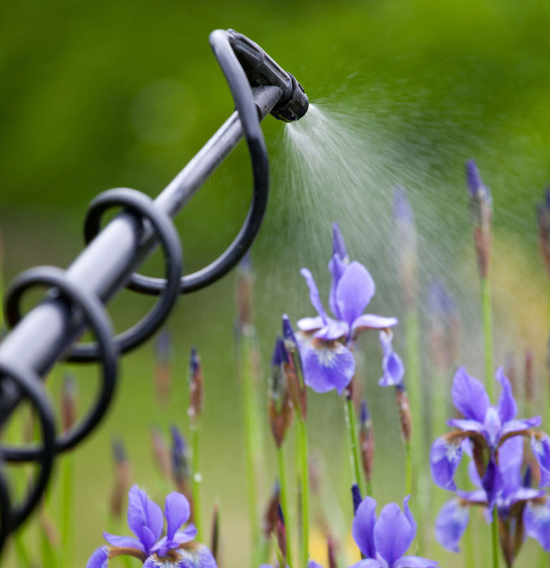 A close-up of a garden sprayer nozzle spraying water onto blooming purple iris flowers, ideal for prompt pest control, with a blurred green background. -A&B Eco-Safe Pest Control